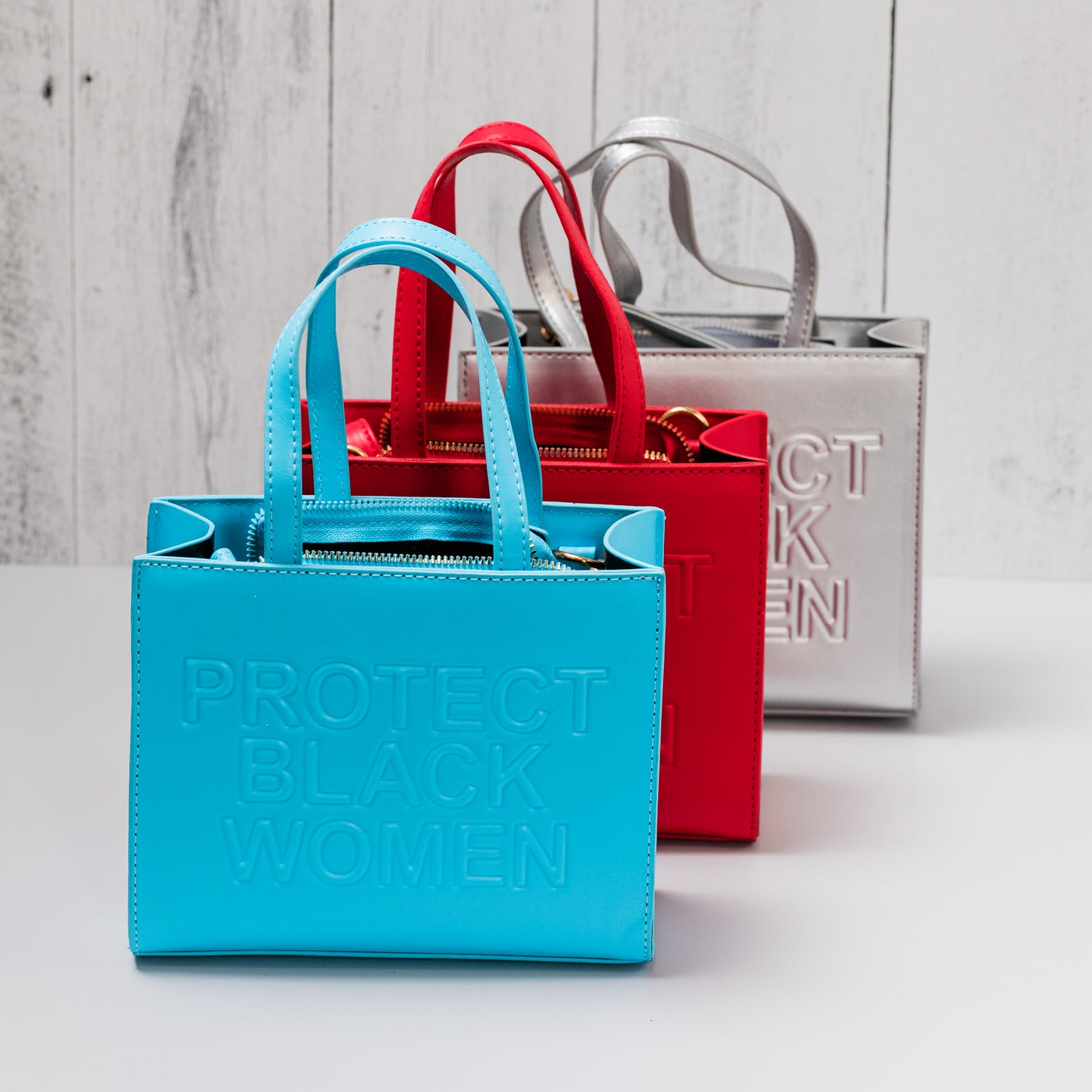 Gorgeous handbag with bold font embossed "PROTECT BLACK WOMEN" logo. These featured bags were purchased above wholesale costs directly from a Black Woman Owned Business.